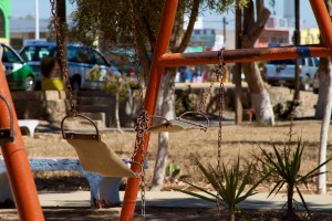 This picture was taken in a park in Mexico. I am not sure if this swing set is functional but it looks like one from a deserted town.