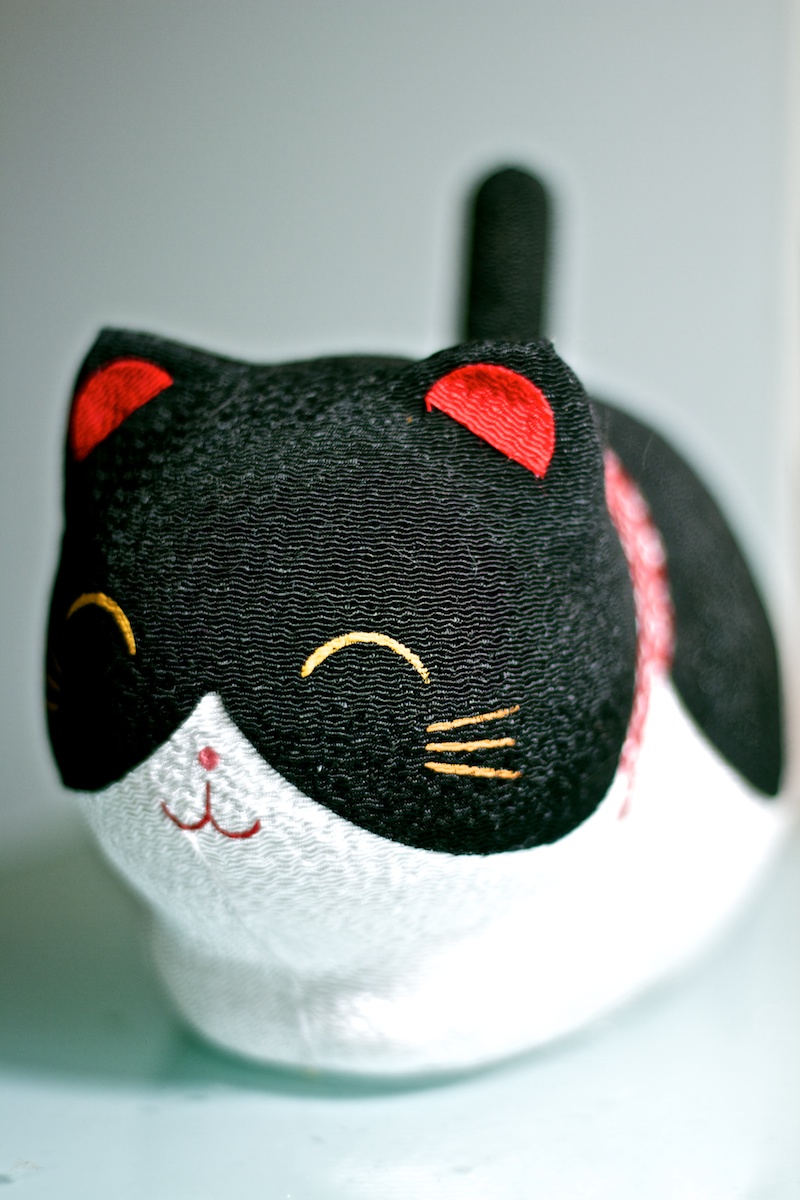 This is a photo taken of Deb’s Robotic version of our cat Kitty Boy. It’s wagging tail is driven by solar power. So it is green as well!