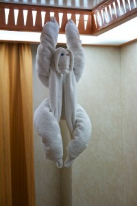 Here is a photo of a monkey made from towels. Each day on our cruise, our ship steward made different animals from towels. This was my favorite.