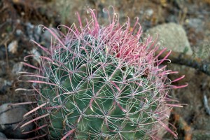 This is a photo of cactus where the pink extensions look like curled ribbons on a present. The pink color looks so vibrant against the muted green background of the cactus.